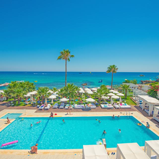 Dit trendy hotel ligt in Protaras en grenst pal aan het beroemde, ‘Fig Tree Bay’. Vooral strandliefhebbers komen hier helemaal aan hun trekken; het zachte zand ligt hier letterlijk aan je voeten. Jij of je partner niet zo’n fan van al dat zand? Geen nood: tussen het hotel en het strand ligt een fijn zwembad met grasweide. Terwijl de een in het zilte water dobbert, kan de ander lekker in het zwembad plonsen.